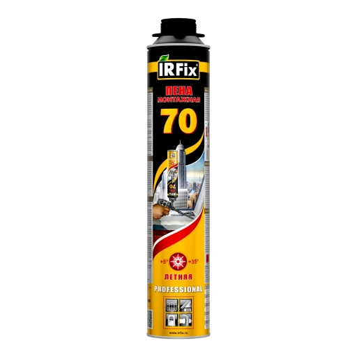 Высококачественная однокомпонентная полиуретановая монтажная пена летнего применения IRFix 70 в аэрозольной упаковке 880мл. Используется с применением специального монтажного пистолета.