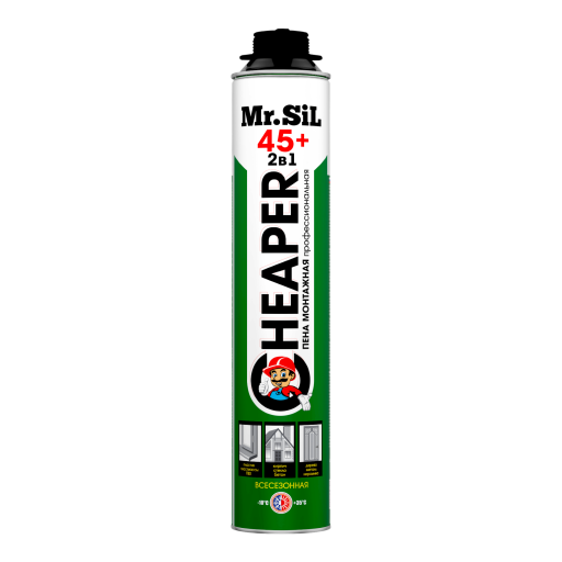 Высококачественная однокомпонентная полиуретановая монтажная пена всесезонного применения Mr.Sil CHEAPER 2в1 45+ в аэрозольной упаковке 750мл. Используется с применением специального монтажного пистолета.